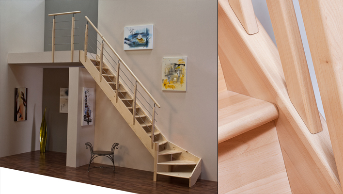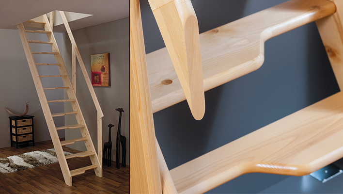 Elegant lofttrappa/våningstrappa i massiv obehandlad bok eller gran. Finns som rak, vänster eller högervriden.